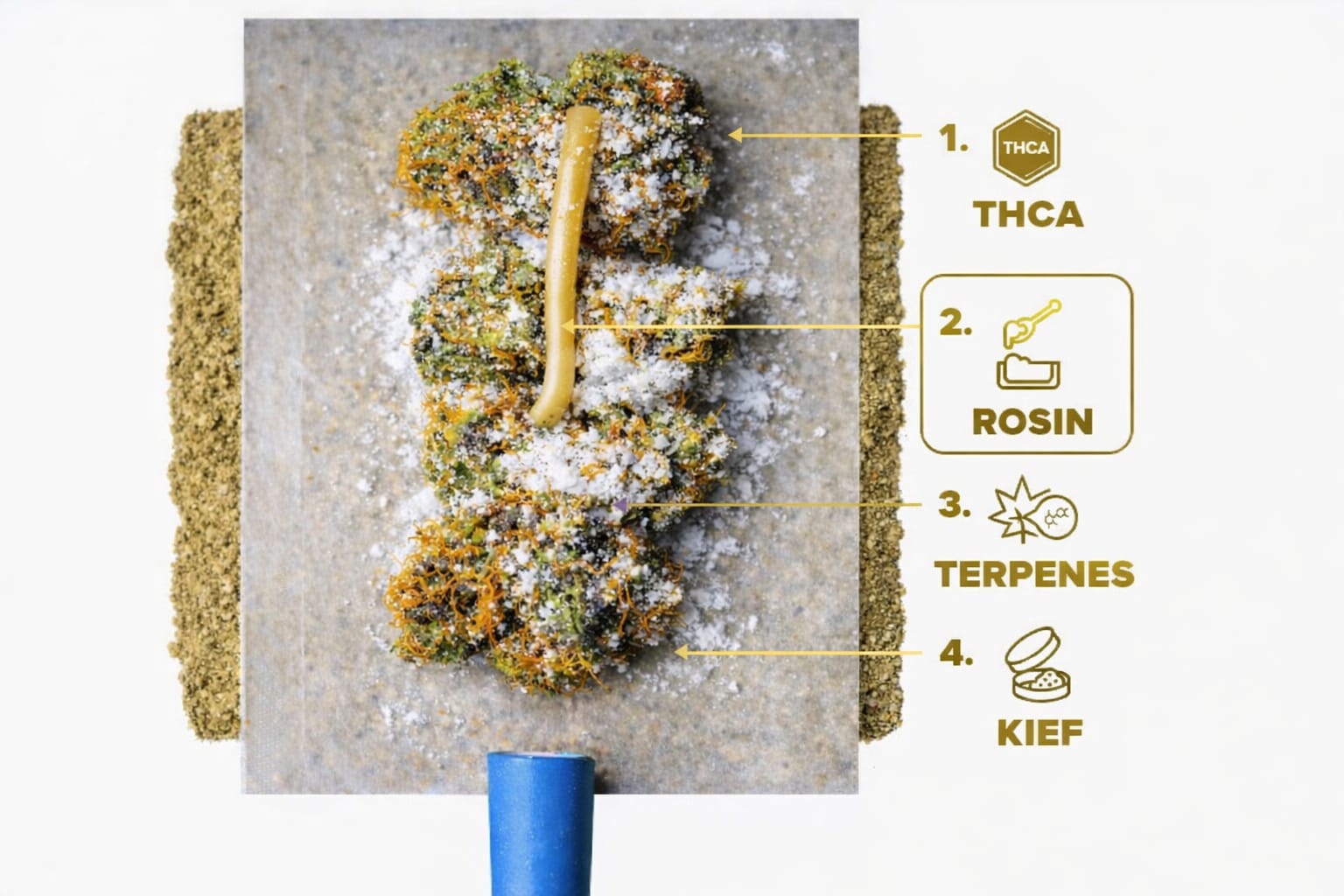 Základem je živá kalafuna, získaná šetrným mechanickým procesem bez použití rozpouštědel. Díky tomu si uchovává plnou komplexnost rostliny – od jemných terpenových nuancí až po přirozenou sílu kanabinoidů. Výsledkem je charakter, který působí autenticky, vyváženě a noblesně.